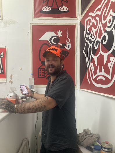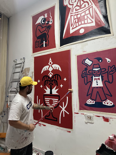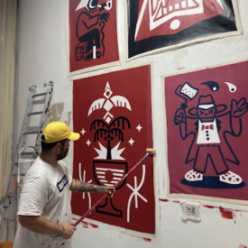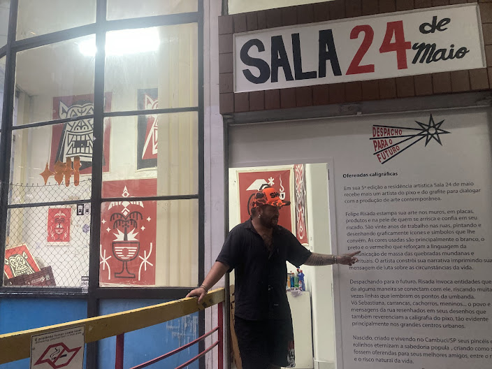 Felipe Risada 1989, nascido e criado no Cambuci São Paulo, conhecido por suas obras de arte urbana que misturam elementos do pixo, do grafite e de símbolos espirituais e do imaginário popular, usando a técnica do rolinho como sua marca registrada de linhas grossas e sucintas que são símbolos que espalha pelas empenas e muros da cidade. Ele começou a pintar nas ruas em 2005, aos 16 anos, utiliza poucas cores como branco, preto e vermelho para reforçar a linguagem de comunicação de massa com temas da sabedoria popular, formando grandes imagens que se destacam de maneira inconfundível nesse flerte da arte pop e da arte popular, no encontro de dois tempos o contemporâneo e as tradições populares, em um estilo autentico e inconfundível . Formado em Design Gráfico pela Belas Artes de São Paulo, desde 2005 se dedica a percorrer SP de bicicleta criando e pintando seu próprio